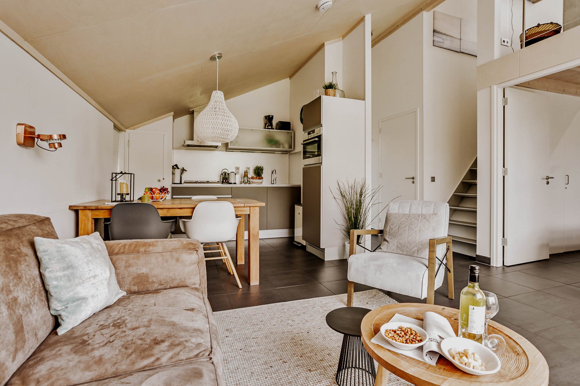 The open designer kitchen is equipped with full kitchen inventory, dishwasher, microwave, filter coffee maker, kettle and Nespresso machine. The bedroom on the first floor has a double box spring bed. From this bedroom there is access to the terrace. The bathroom has a shower, toilet, washing machine and dryer.