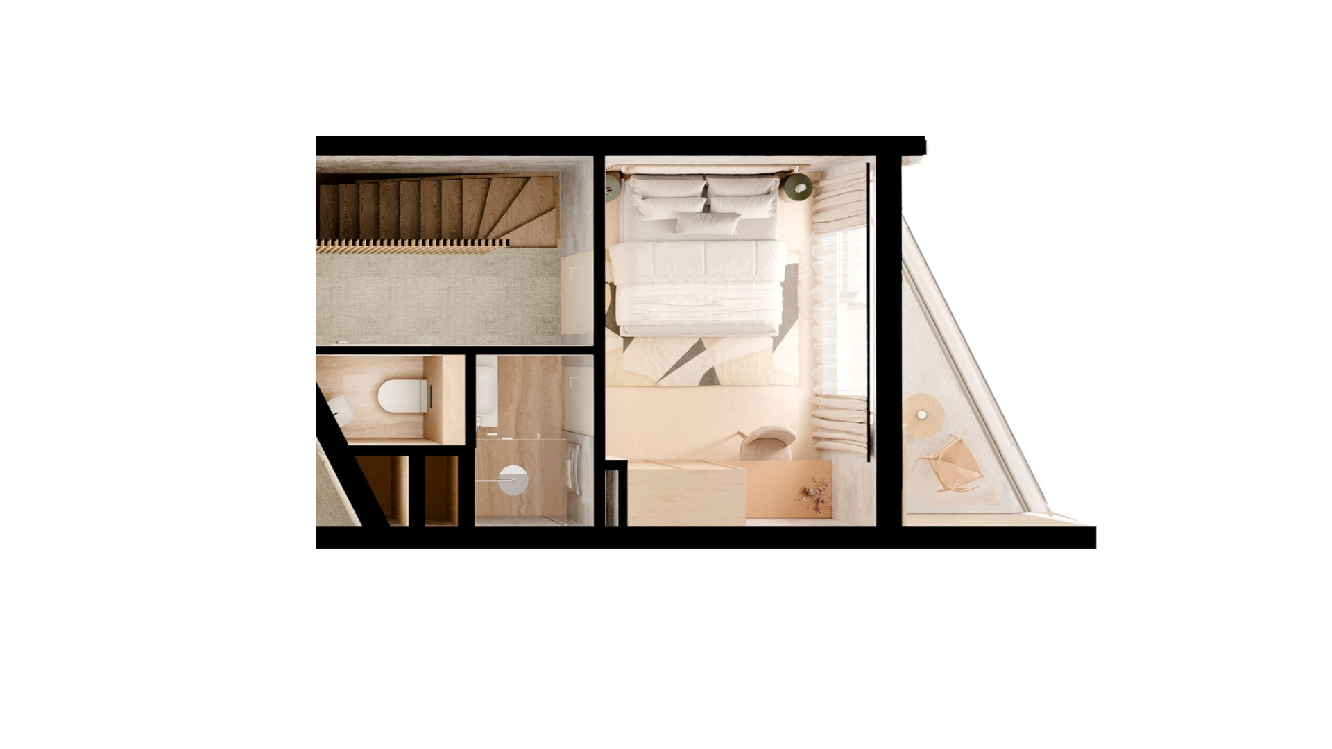 Our duplex apartments vary in layout and location, depending on the type and booked floor. The entrance is always on the second floor, where the first bedroom and bathroom are also located. From the hallway, a staircase leads to the upper or lower level, depending on the apartment type.