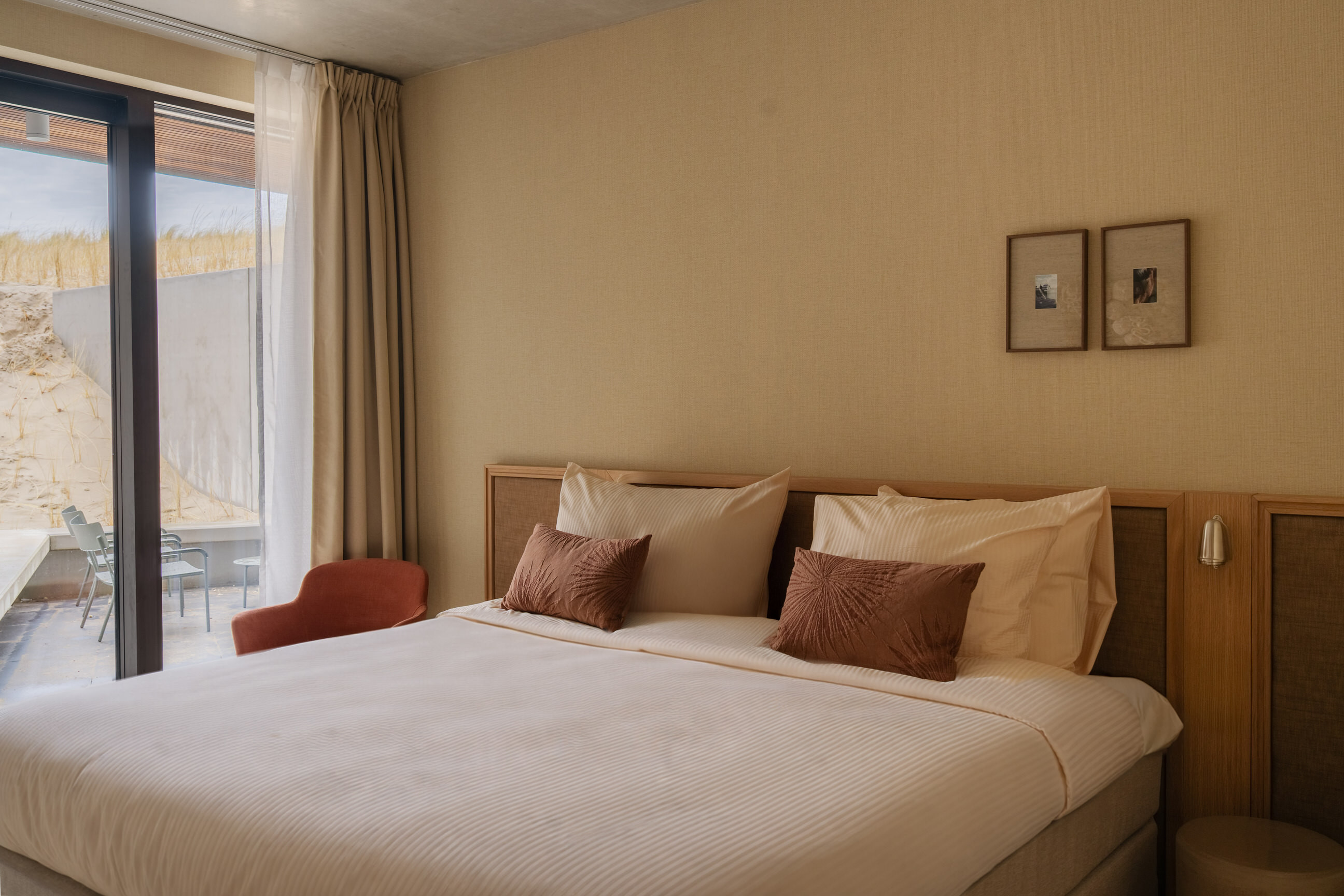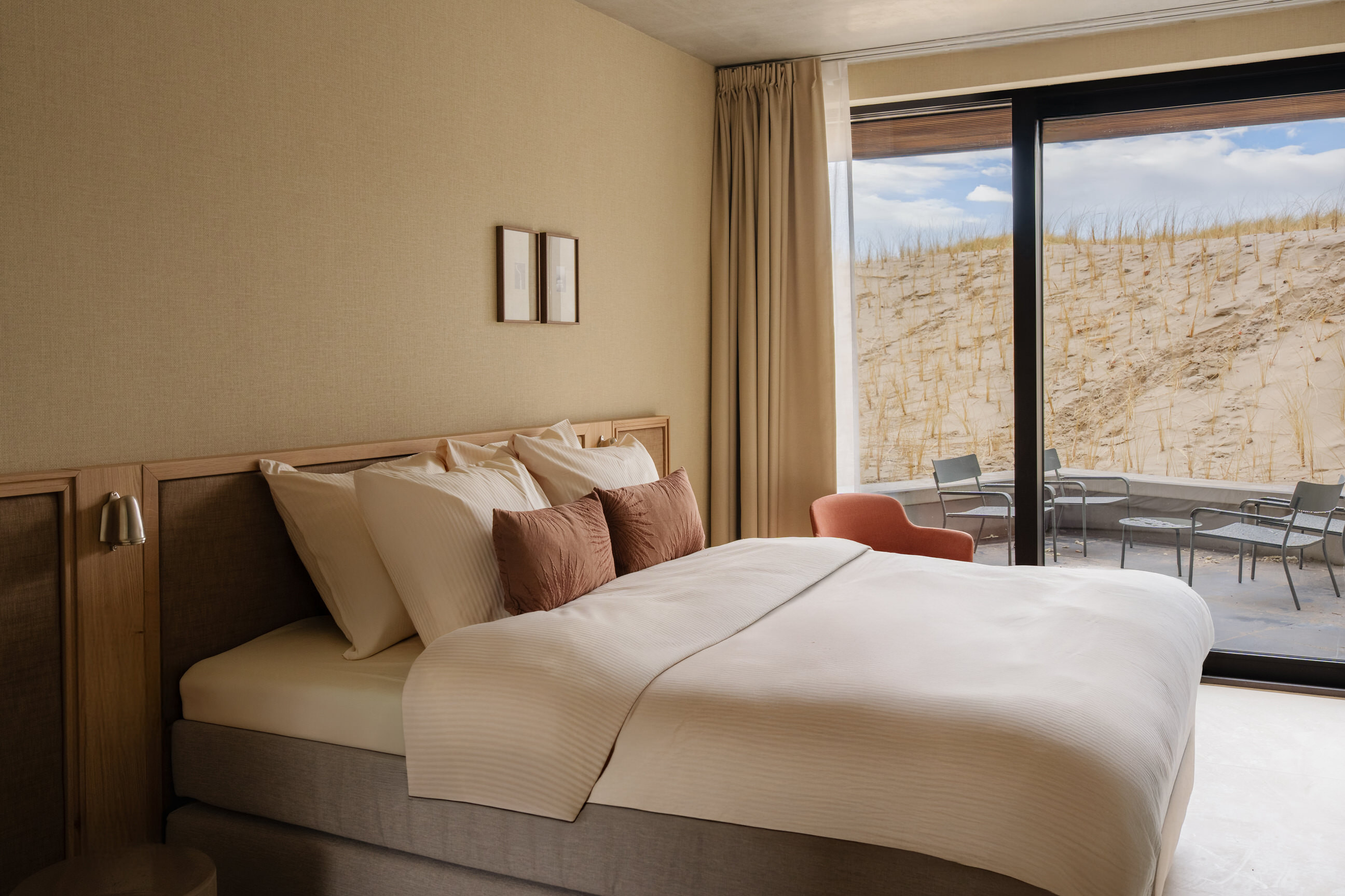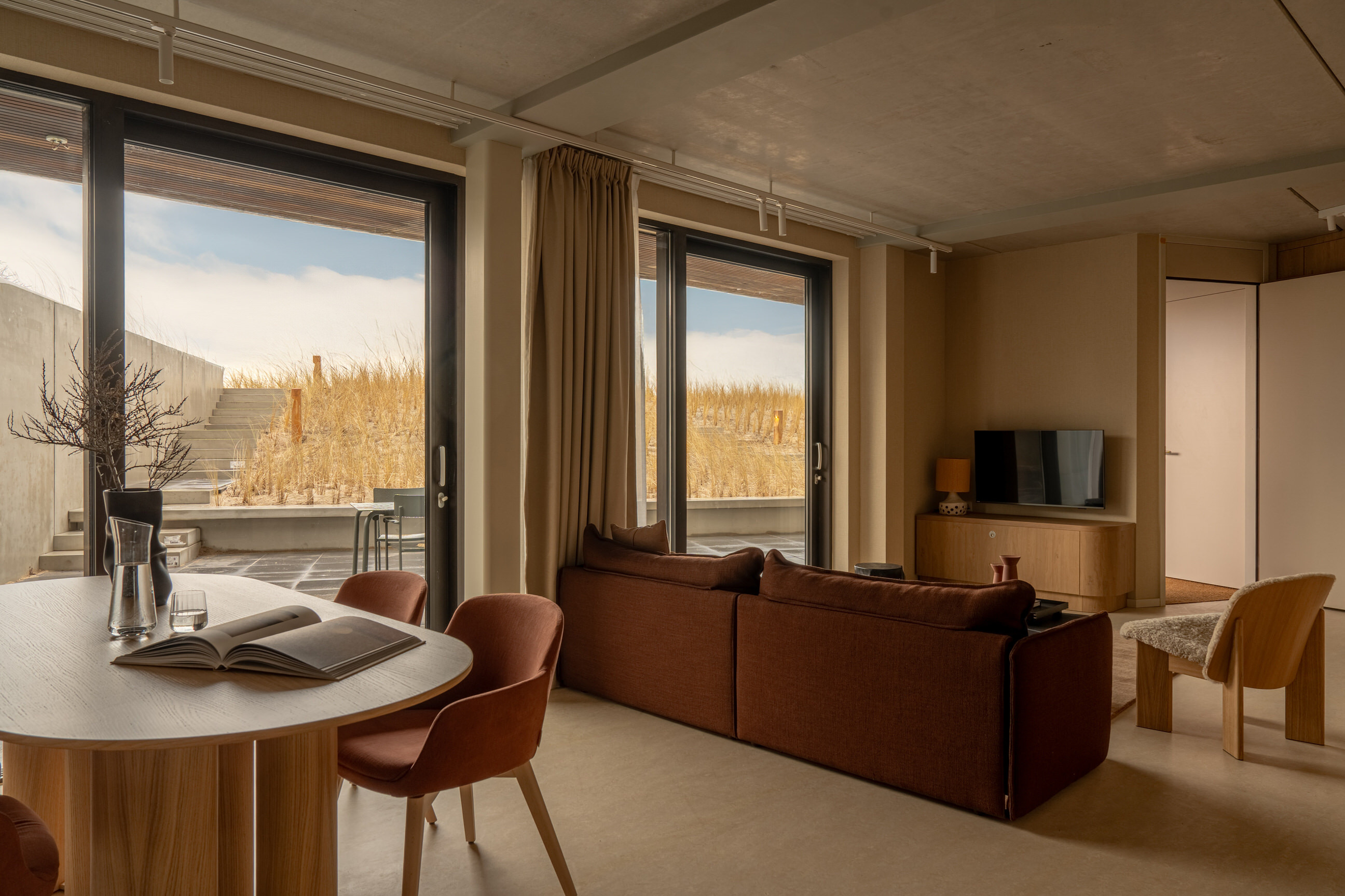 The living room is tastefully decorated with a comfortable sofa, armchairs and a Smart TV. From here, you can step straight onto the private terrace, which is furnished with stylish outdoor furniture. Thanks to its unobstructed location, you can enjoy direct access to the dunes – a unique place where indoors and outdoors merge effortlessly. The apartment also has free WiFi, a washing machine and a dryer for extra convenience.