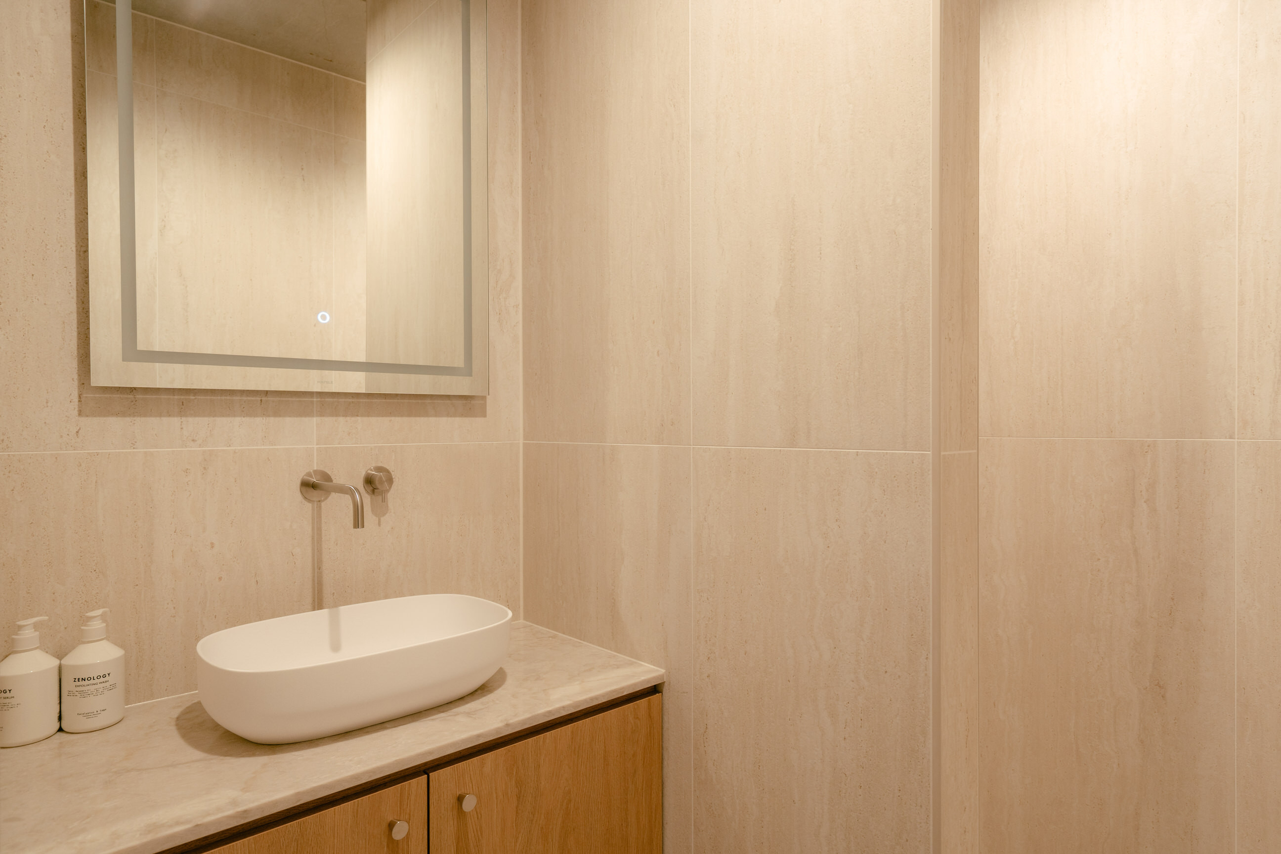 The apartment has two stylish bedrooms with luxurious box-spring beds and high-quality bed linen, each with its own bathroom with walk-in rain shower, exclusive Zenology® toiletries, soft towels, bathrobes, slippers and a hairdryer.