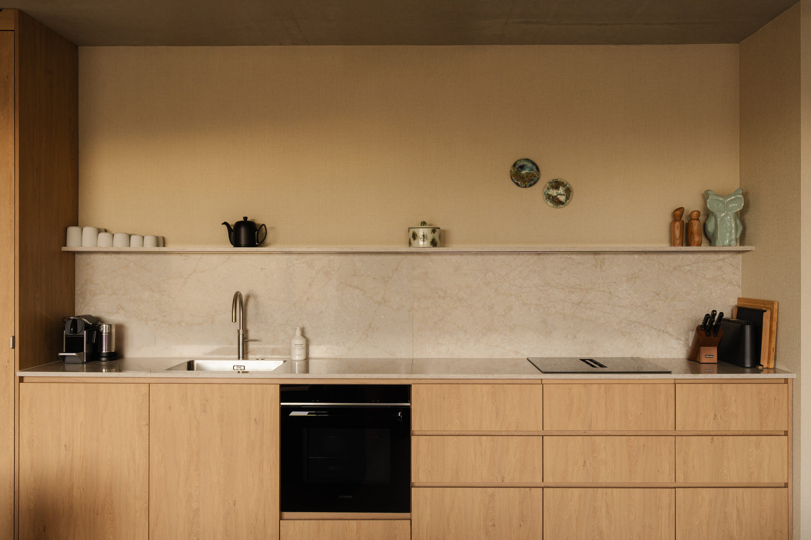 The open kitchen is fully equipped and offers all the modern facilities you need: a coffee machine (cups), Quooker®, dishwasher, fridge with freezer compartment, induction hob, an extensive set of pans and high-quality crockery and glassware.